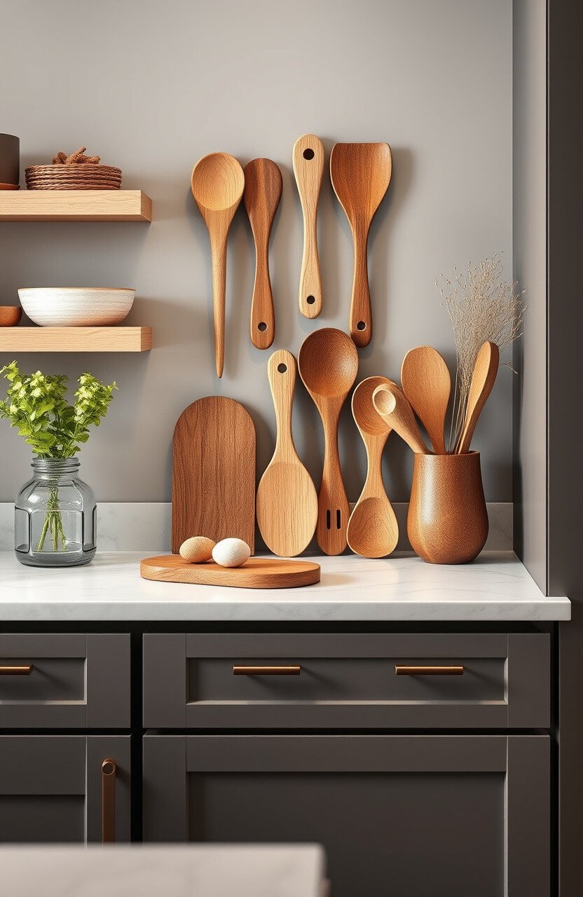 Add warmth with handcrafted wooden utensils. They’re both functional and charming.
