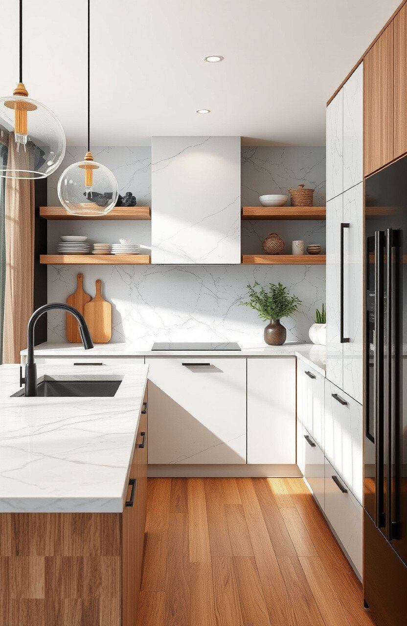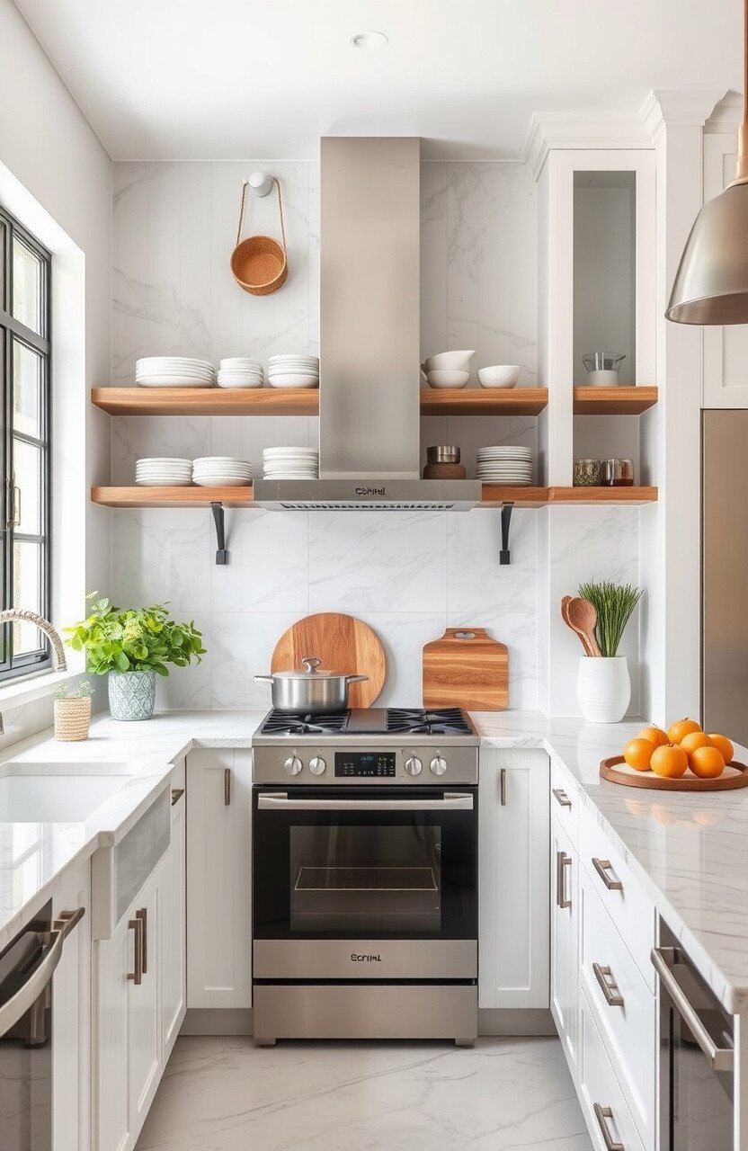 Combine marble countertops with open shelving for a fresh and airy feel. It’s a great way to display your favorite items.