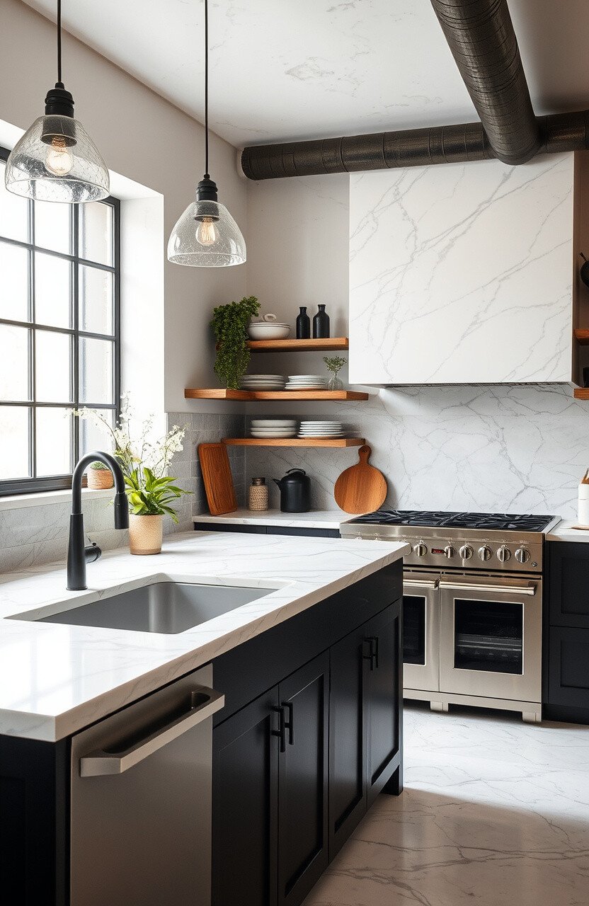 Combine marble with industrial chic elements for a trendy look. It’s a balance of elegance and edginess.