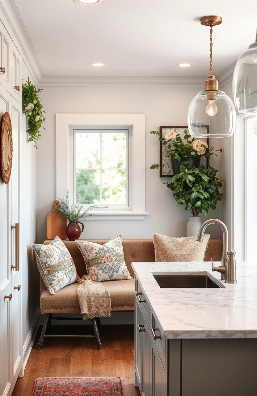 Create a cozy corner with marble countertops. It’s a perfect spot for morning coffee or evening chats.