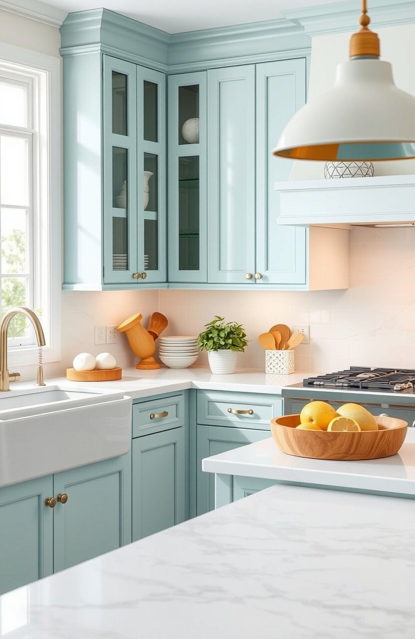 Combine marble with pastel colors for a soft look. It’s a calming choice that’s perfect for creating a serene kitchen.