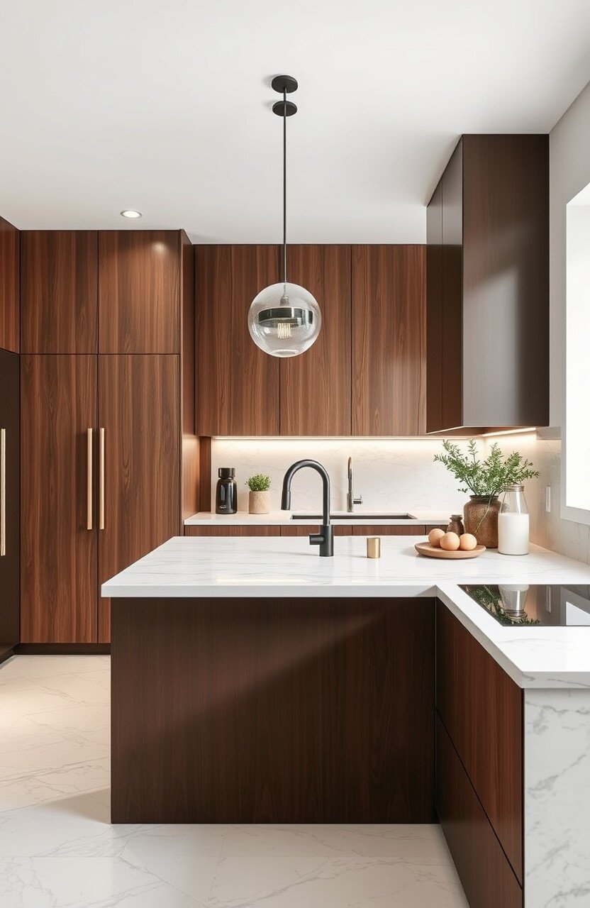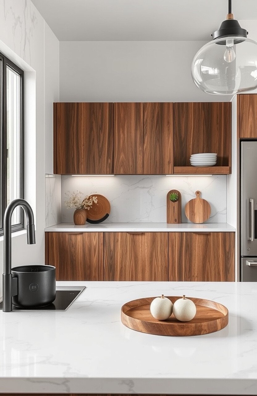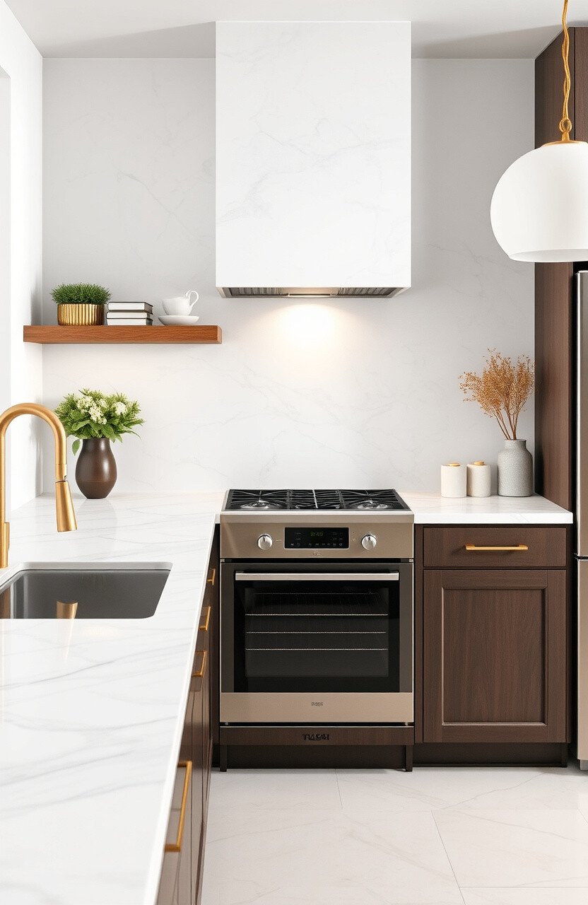 Pair marble countertops with warm wood accents for a cozy look. It’s a harmonious choice that adds warmth to your kitchen.