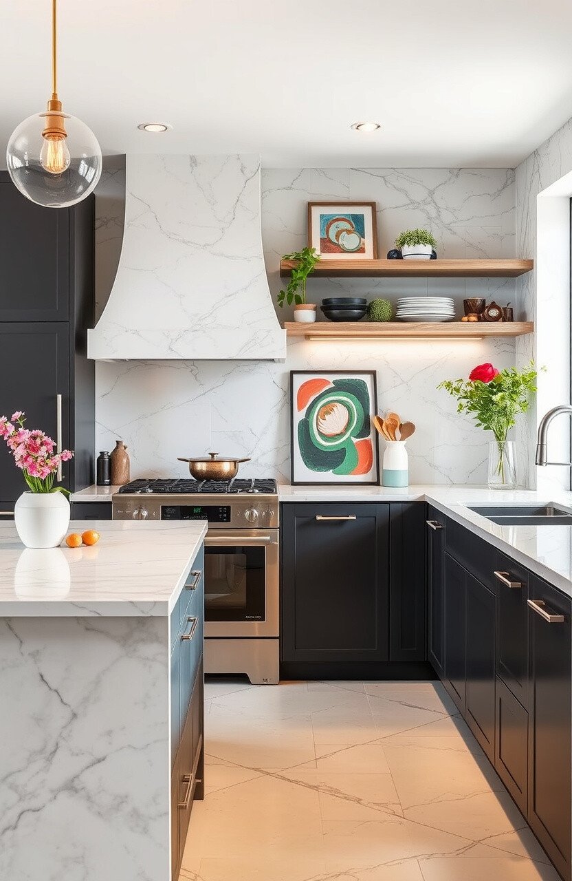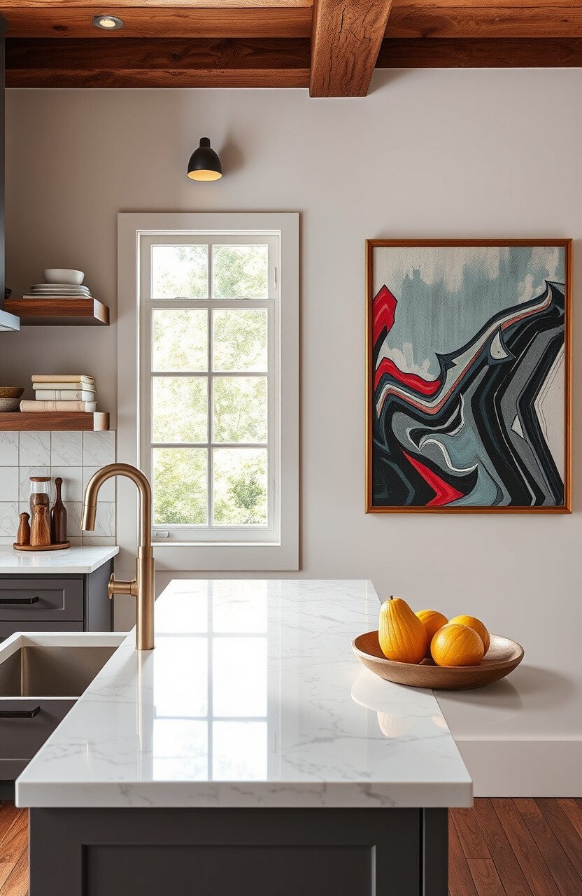 Use statement art to complement your marble countertops. It’s a bold choice that adds personality to your kitchen.