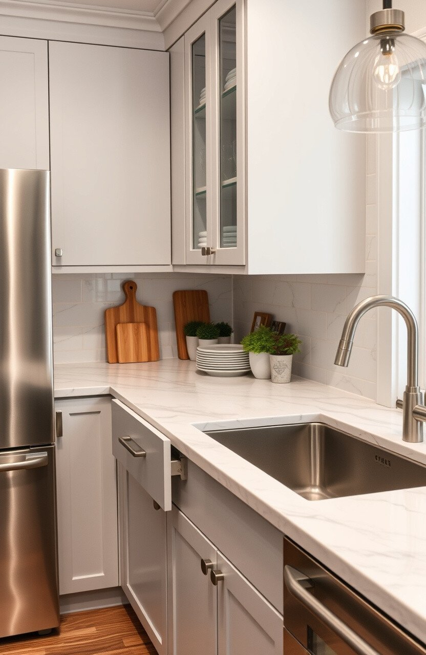 Incorporate hidden storage with your marble countertops for a clean look. It’s a stylish way to keep your kitchen tidy.