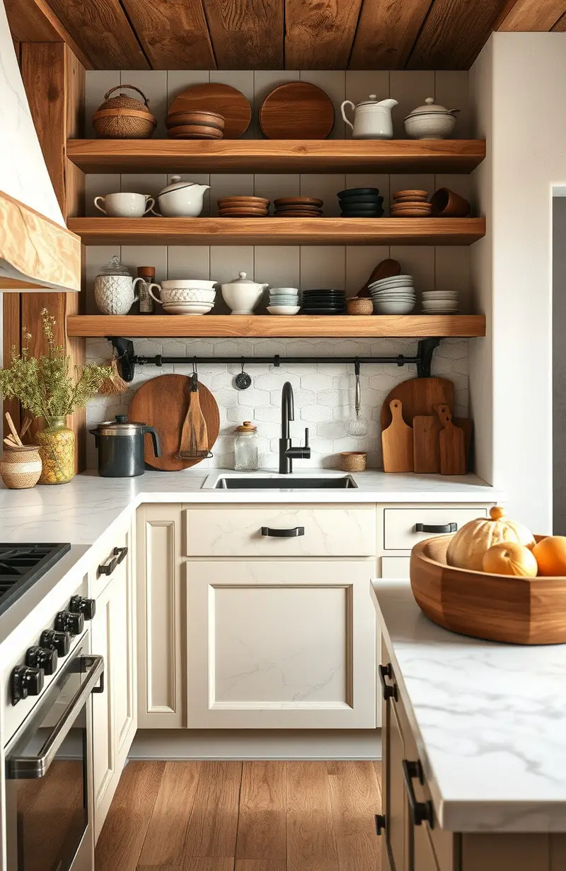 Use wooden cabinets or shelves to intensify the rustic vibe. Adding vintage kitchenware can also enhance the charm.
