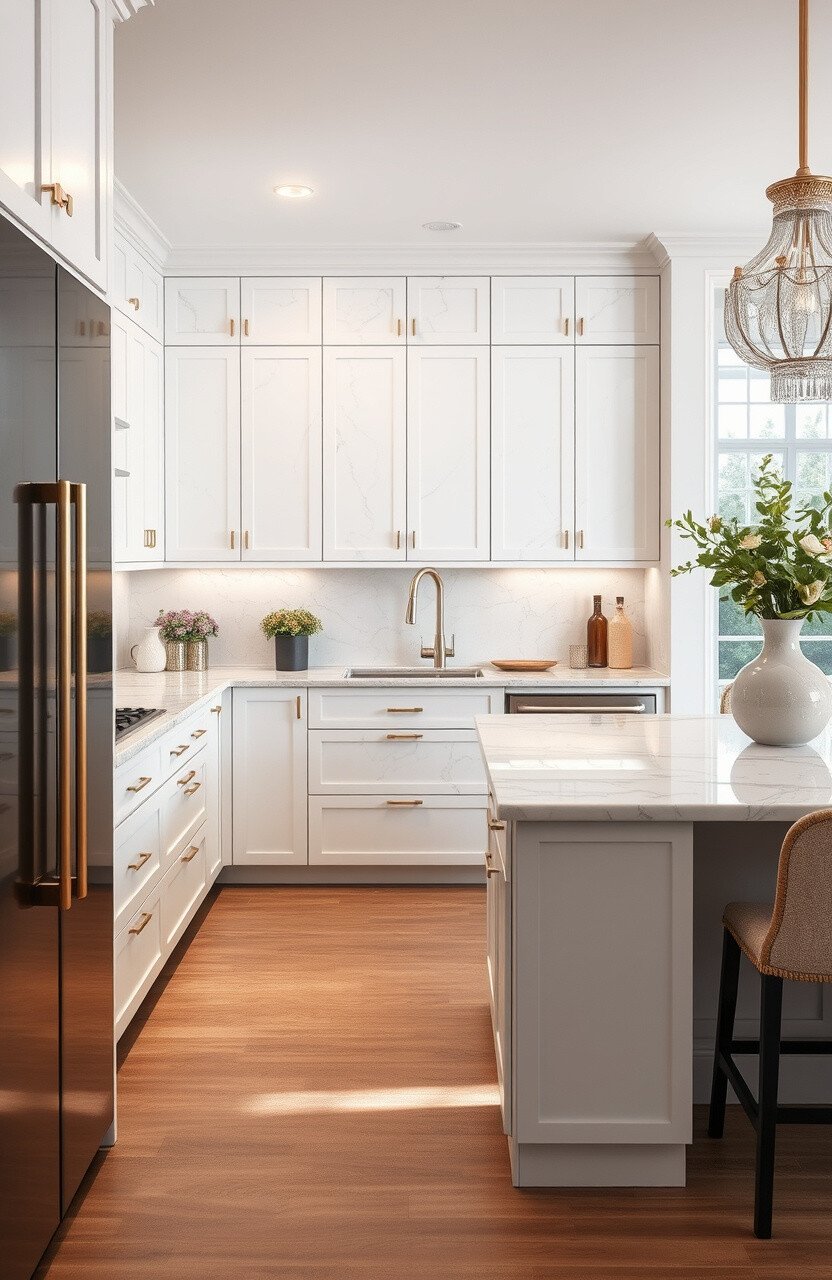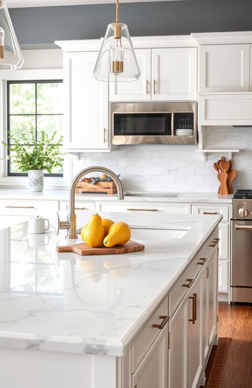 Use white marble to create a bright and airy kitchen atmosphere. It reflects light beautifully, making your space feel open and inviting.