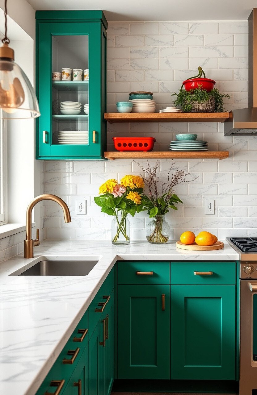 Add bright pops of color to your marble kitchen for a lively touch. It’s a fun choice for those who love color.