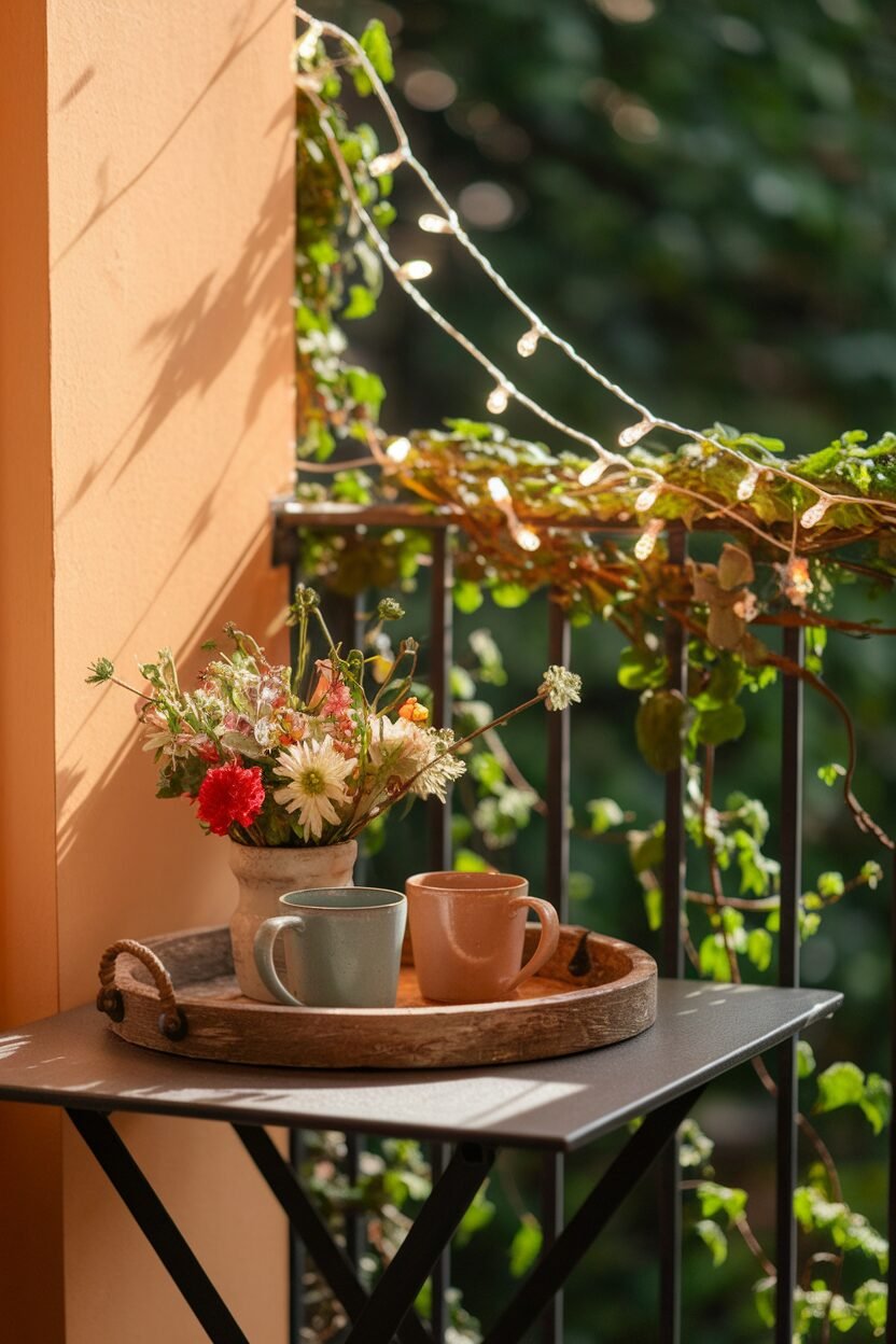 A small table is essential for your balcony, providing a spot to set down drinks or snacks. Look for one that fits your space, whether it’s round, square, or a foldable option.