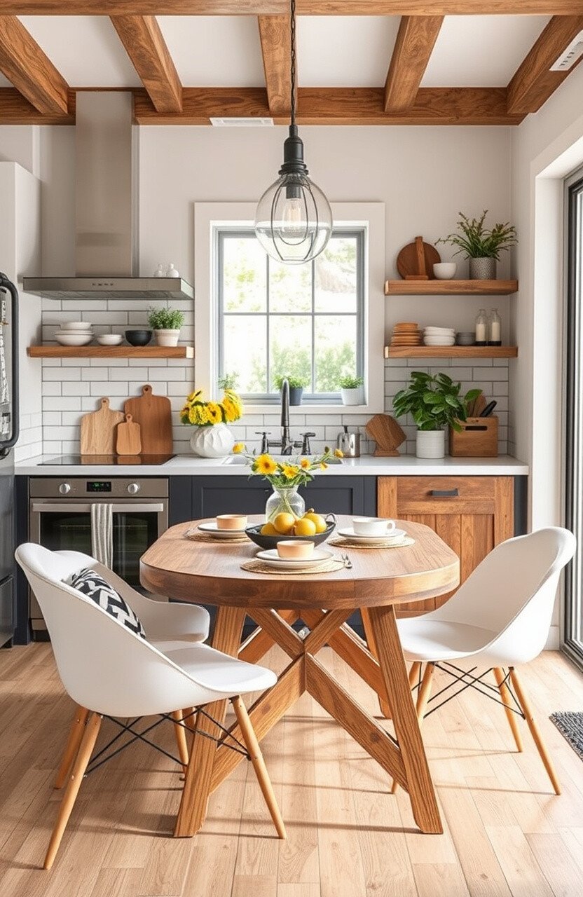 Use a round table and cushioned chairs for comfort. It’s a cozy and inviting space.