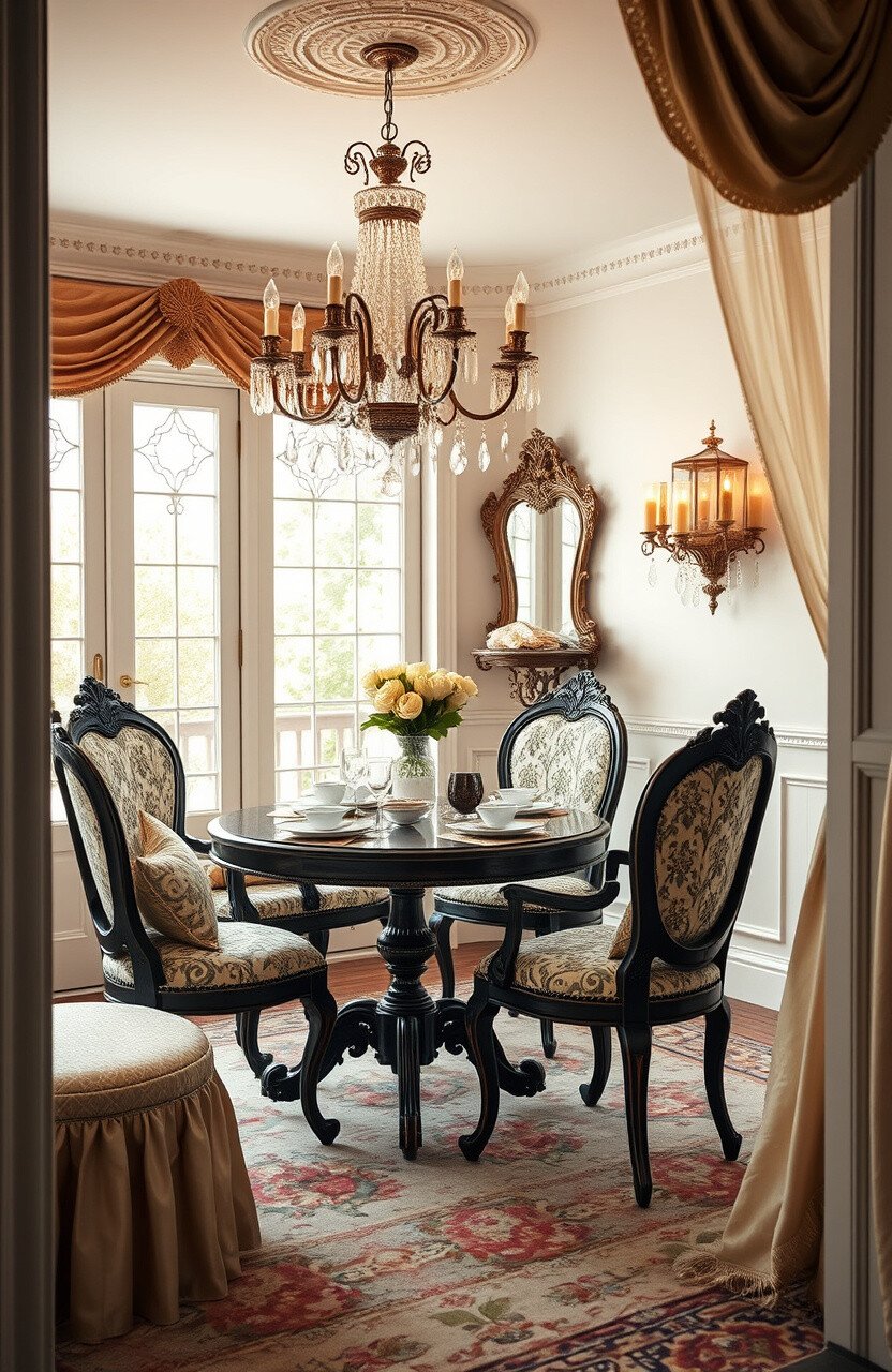 Add a touch of glam to breakfast with vintage style. Use luxurious fabrics and ornate details.