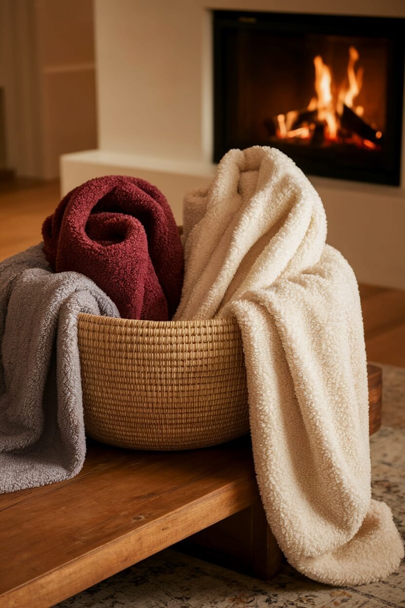 Placing warm blankets in decorative baskets around your living area encourages snuggling up. It’s a functional and stylish way to keep cozy essentials within reach.
