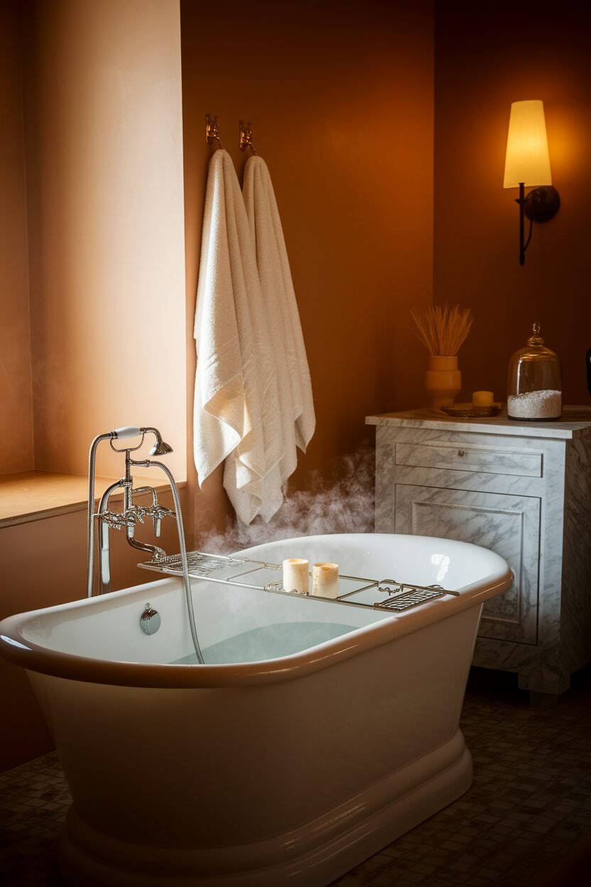 Personalize your bath space with your favorite scents or colors, creating a relaxing environment. Little touches like fresh flowers can elevate the cozy vibe, too.