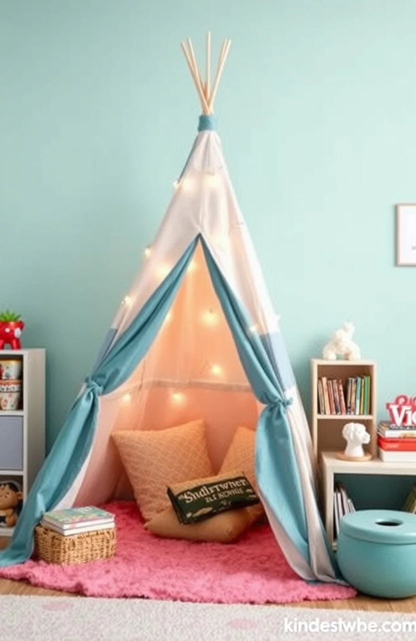 A cozy tent area can be a magical hideaway for playtime or reading. Decorate it with lights and cushions for a snug retreat.