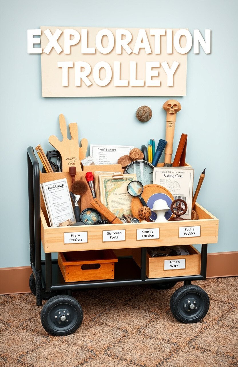 An exploration trolley filled with interesting objects can spark curiosity. Rotate items like magnifying glasses, maps, or fossils to keep it intriguing.