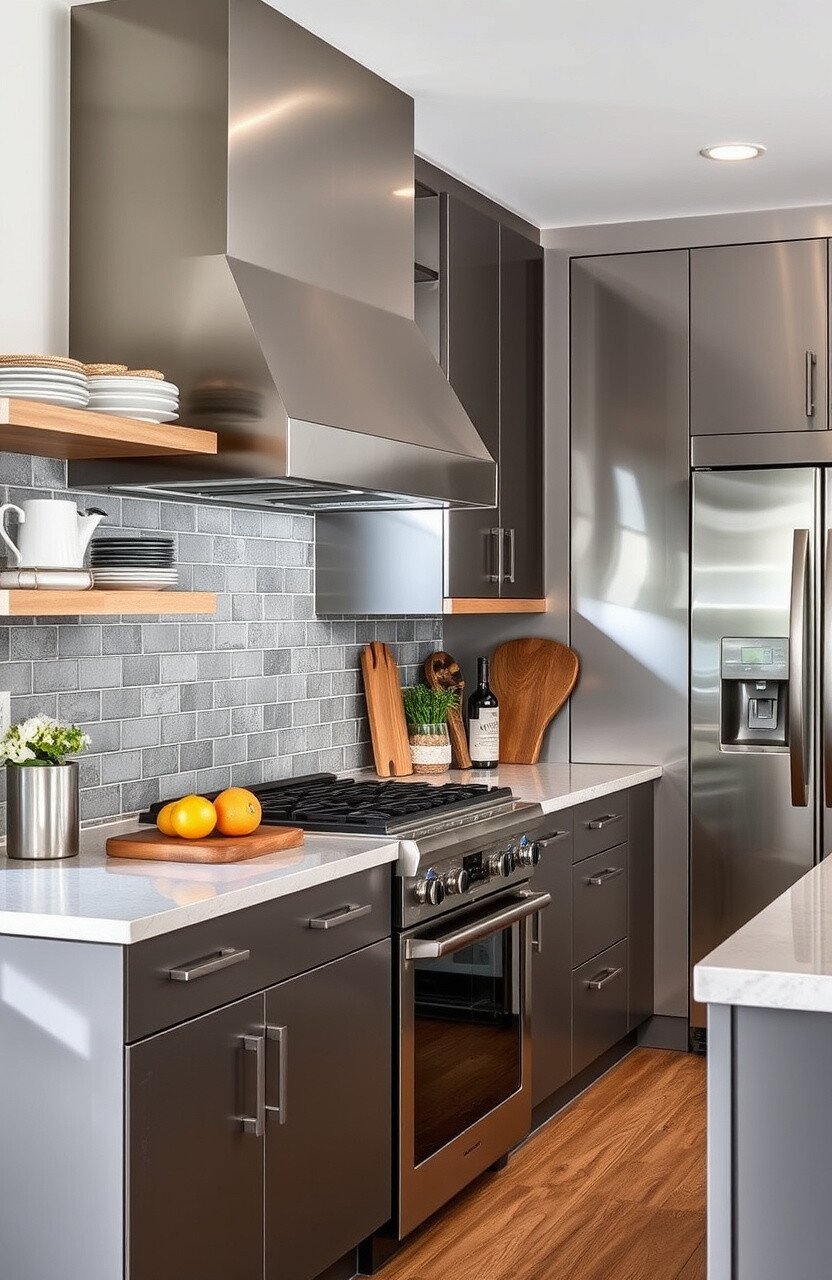 Metal cabinets bring an industrial edge to your kitchen. They are durable and easy to clean, perfect for busy cooks.