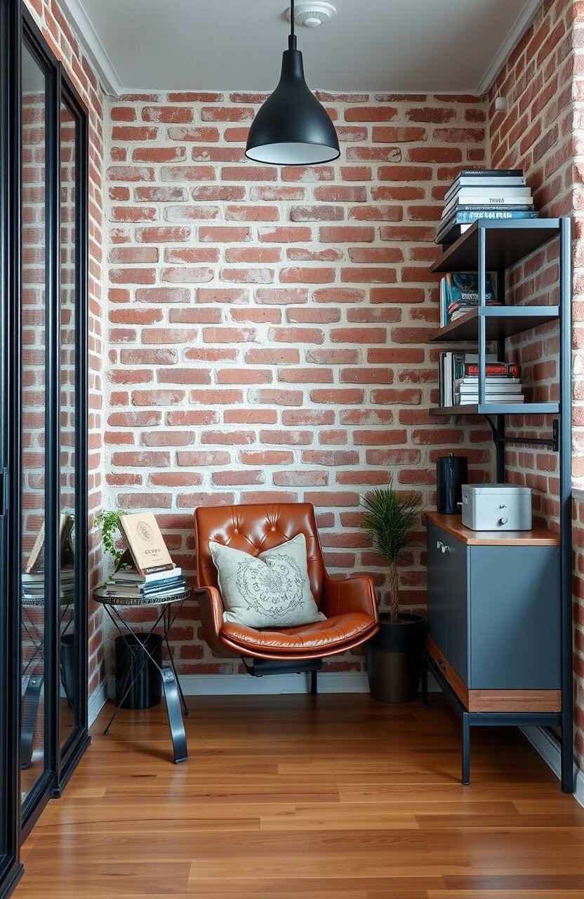 This idea is unique because it uses metal and minimalist decor. Personalize it with a leather chair, a metal side table, and exposed brick.