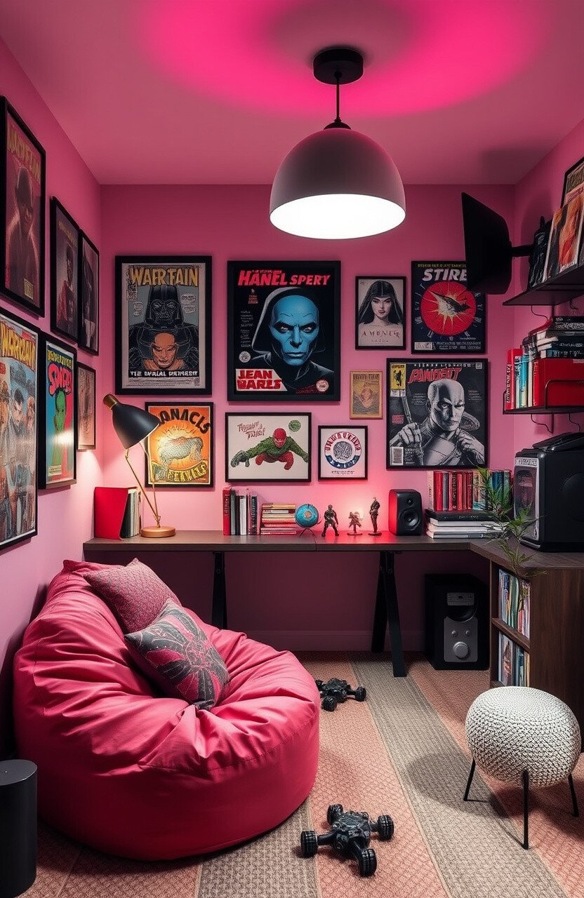 This idea is unique because it uses fandom decor and collectibles. Personalize it with a beanbag chair, comic book posters, and action figures.