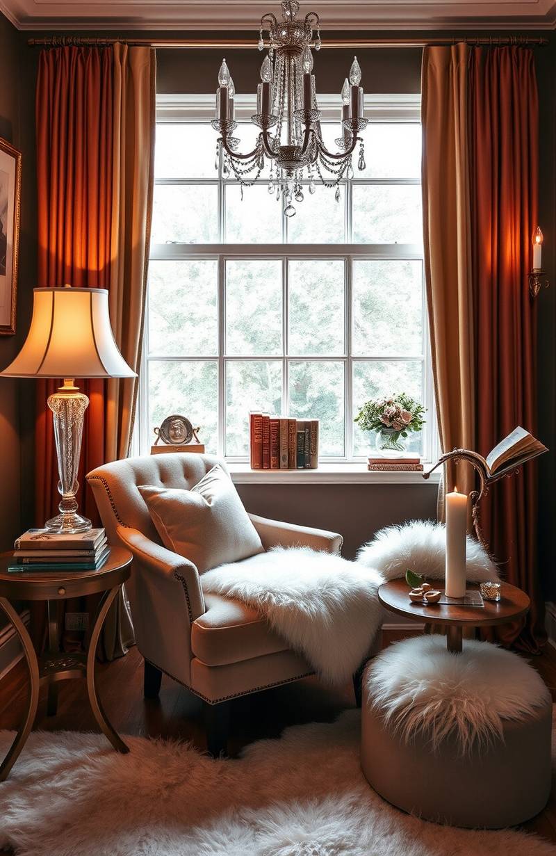 Create a sophisticated reading nook with elegant decor and luxurious materials. Use rich colors and classic pieces for a refined space.