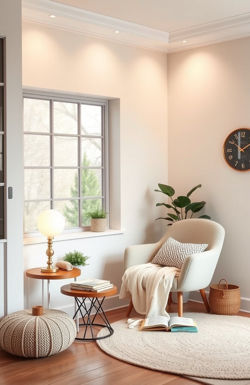 Use a light-colored chair and a wooden side table. Add a soft throw and a cozy rug for warmth.
