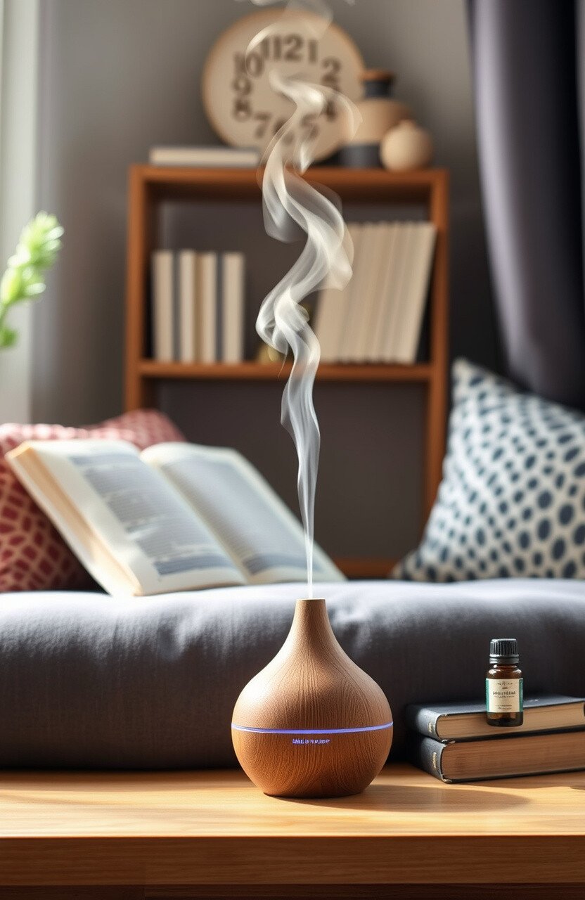 An oil diffuser adds a pleasant scent to your reading area. It creates a calming atmosphere for relaxation.