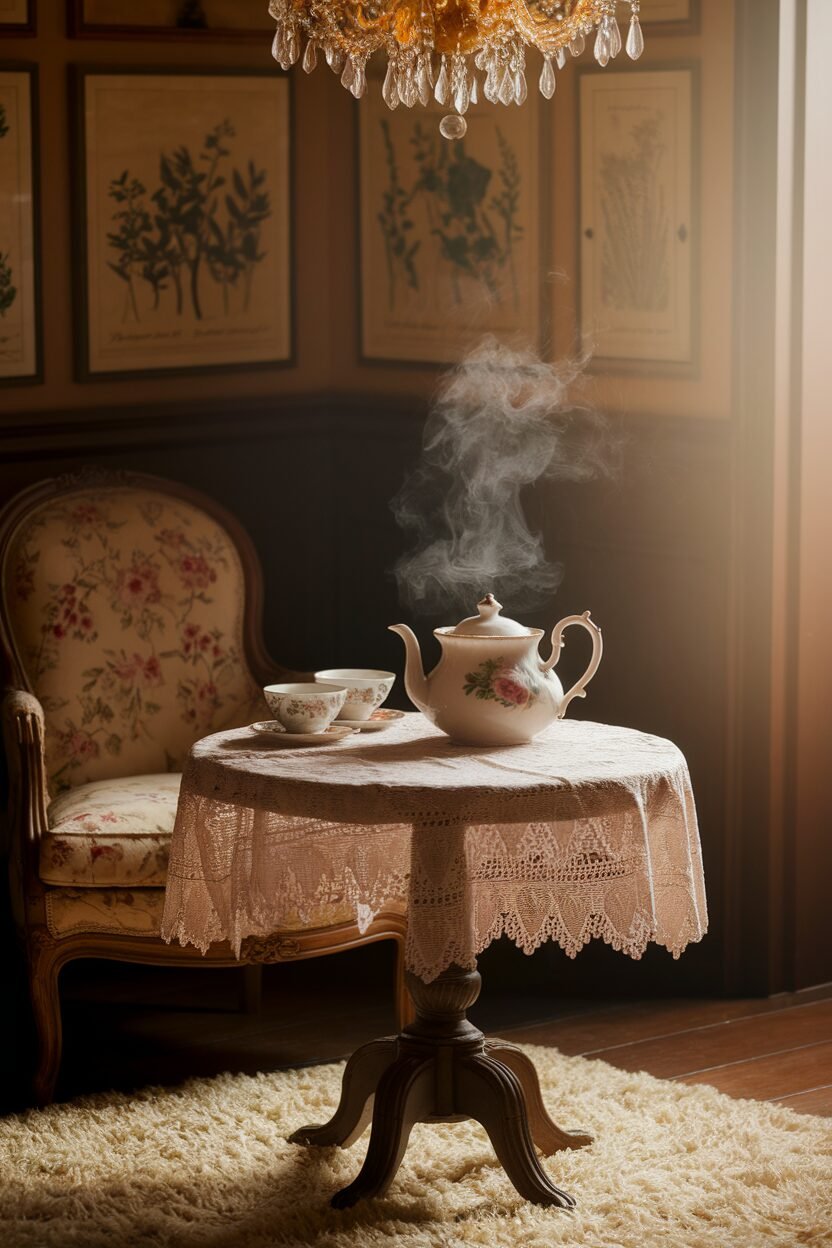 Choose a small table and comfy chairs to create an intimate atmosphere. Adding lace doilies or a vintage tablecloth can enhance the old-world charm.