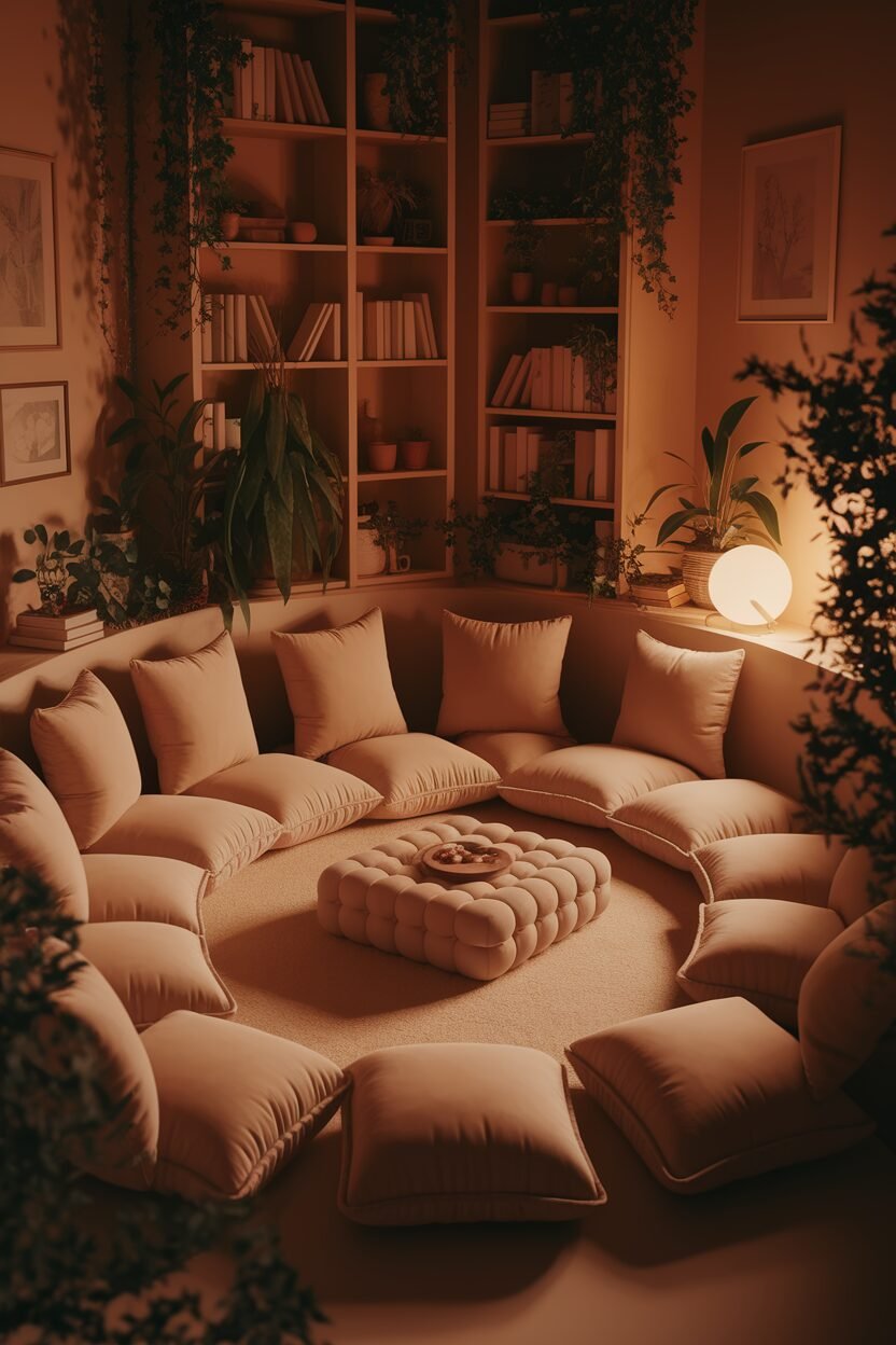 A cozy corner filled with floor cushions can be a fun and laid-back seating area. It’s perfect for informal gatherings or just lounging around.