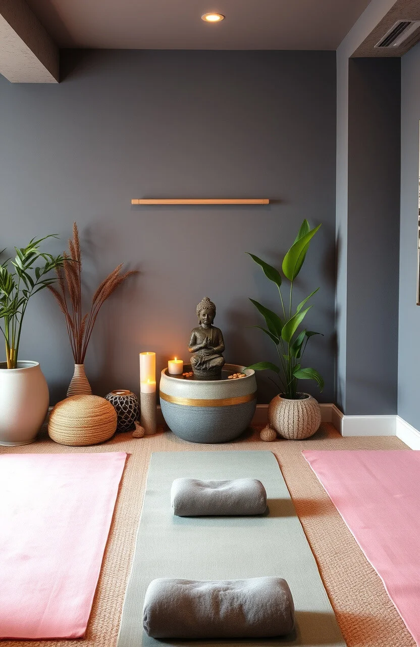 Create a peaceful yoga retreat with soft mats, soothing colors, and a small water fountain for tranquility. Add some indoor plants to bring nature inside.