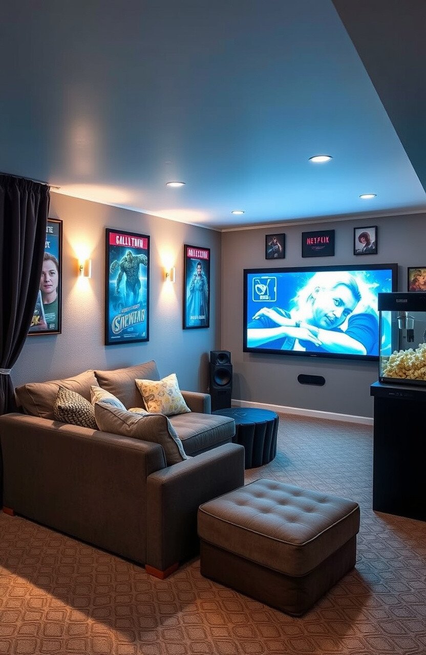 Turn your basement into a mini theater with a comfy couch, a big screen, and a popcorn machine. Decorate with movie posters and dimmable lights for the full cinema experience.