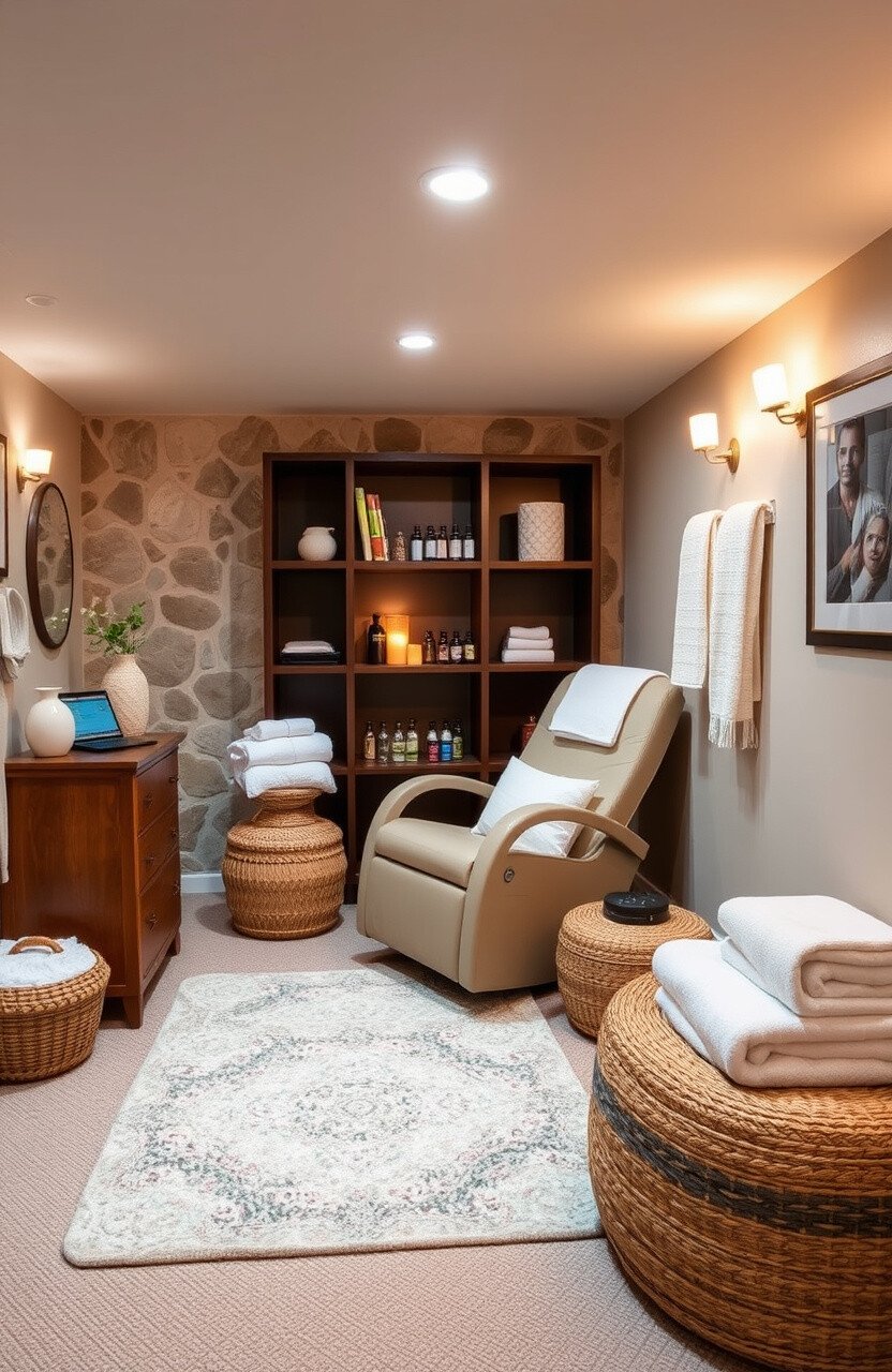 Create a spa sanctuary with a small massage chair, essential oils, and a sound machine with calming nature sounds. Use soft lighting and plush towels for a luxurious feel.