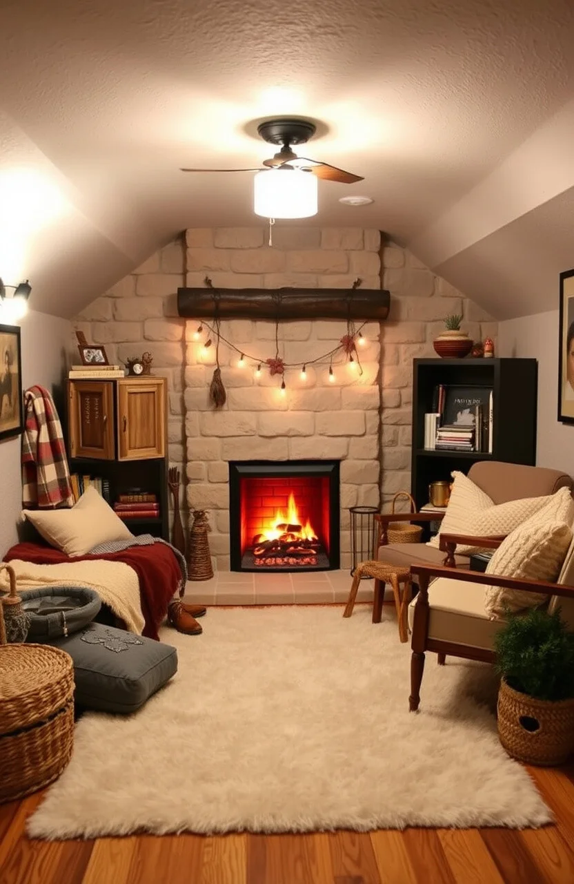 Design a cozy nook with a faux fireplace, soft blankets, and a plush rug. Add a small bookshelf and a comfy chair for the ultimate relaxation spot.