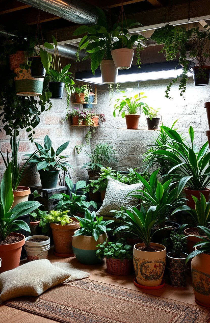 Turn your basement into an indoor garden with potted plants, hanging planters, and grow lights. Add a small seating area to enjoy your lush surroundings.