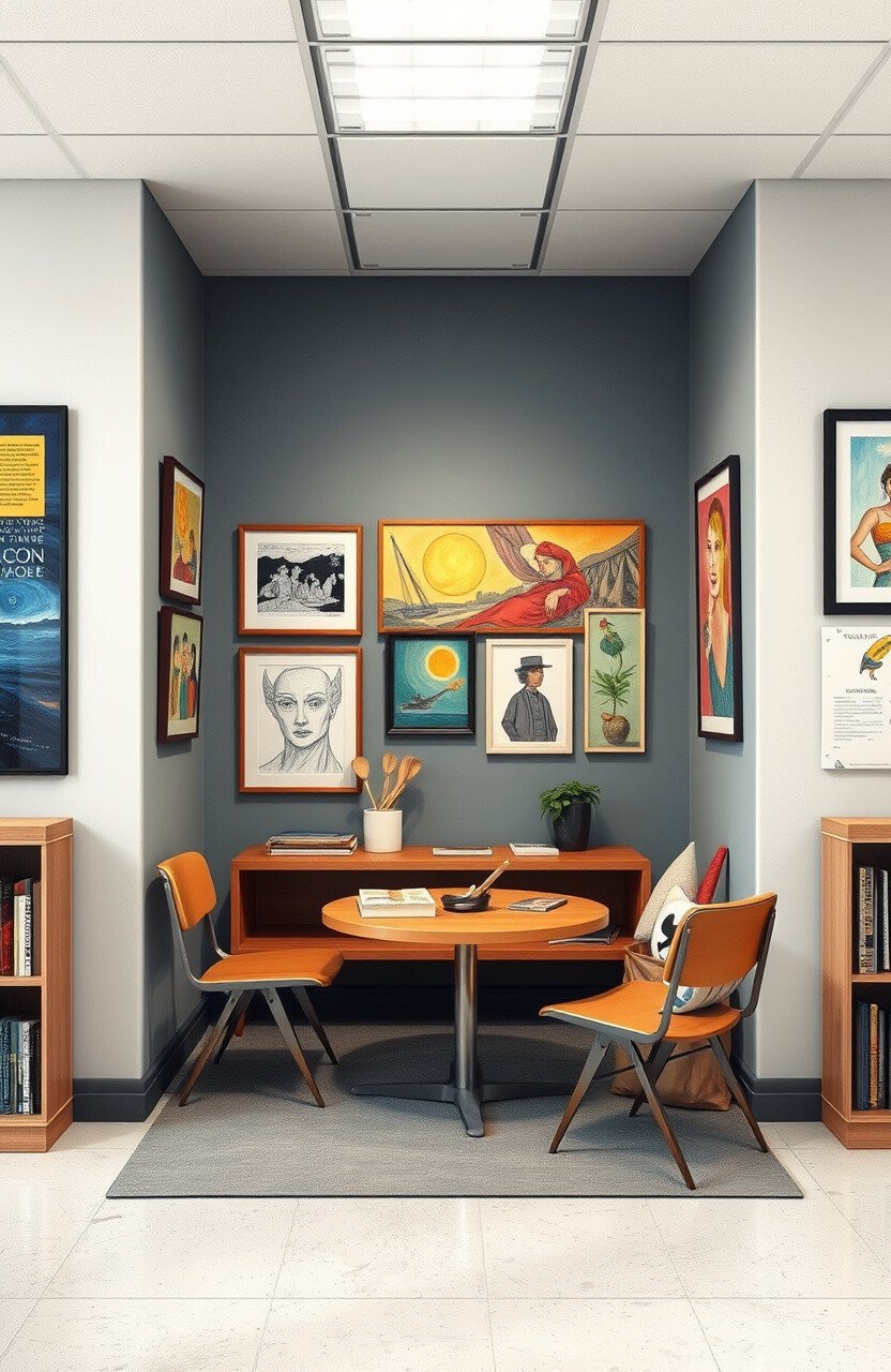 This nook benefits students by providing a cozy space for downtime. It’s unique because it merges literary and artistic worlds. Costs can be minimal with cushions, rugs, and bookshelves.