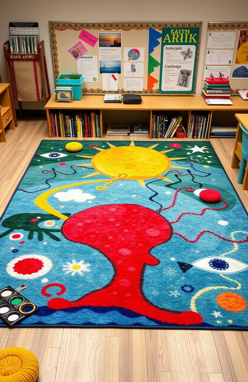 Art-themed rugs add color and texture to the classroom floor. They combine comfort with creativity for a cozy atmosphere.
