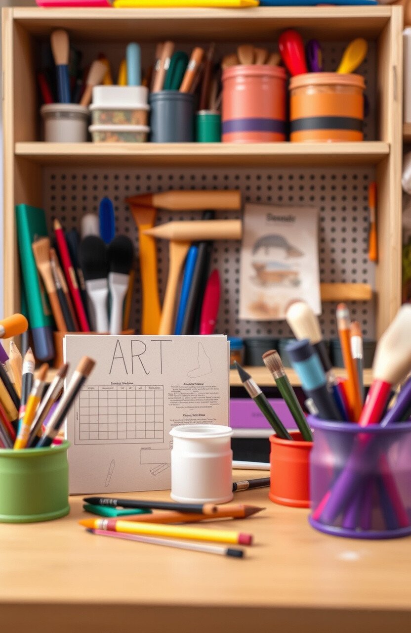 Suggestions include using clear containers for pencils, paints, and brushes. Labeling helps maintain order and encourages responsibility. This approach is trending for its dual functionality.