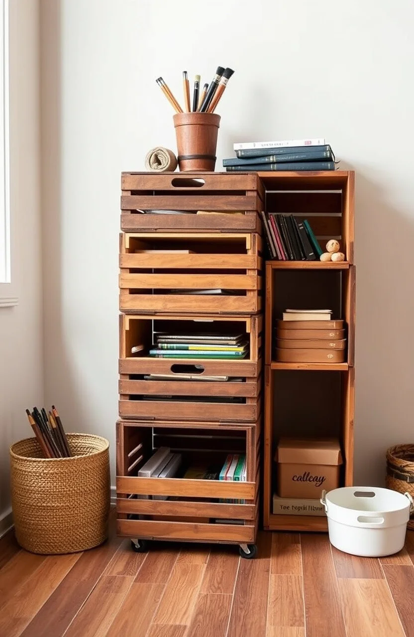 Baskets are not only functional but also add a rustic charm to your space. They can hold larger items like sketchbooks and paper pads.