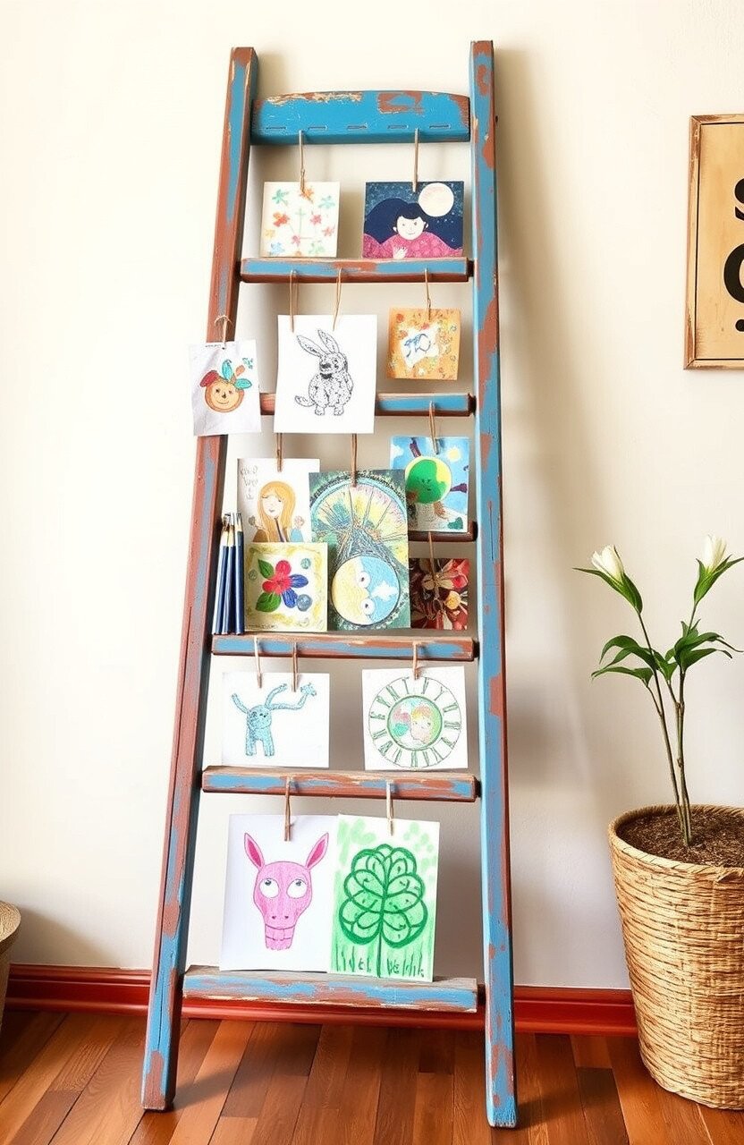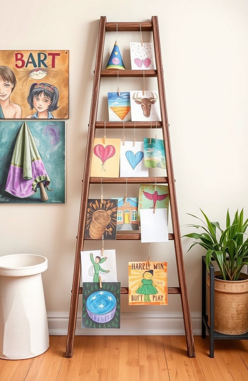 24. Art Ladder Display Use a ladder to hang art pieces. It’s a creative and unexpected way to showcase art.
