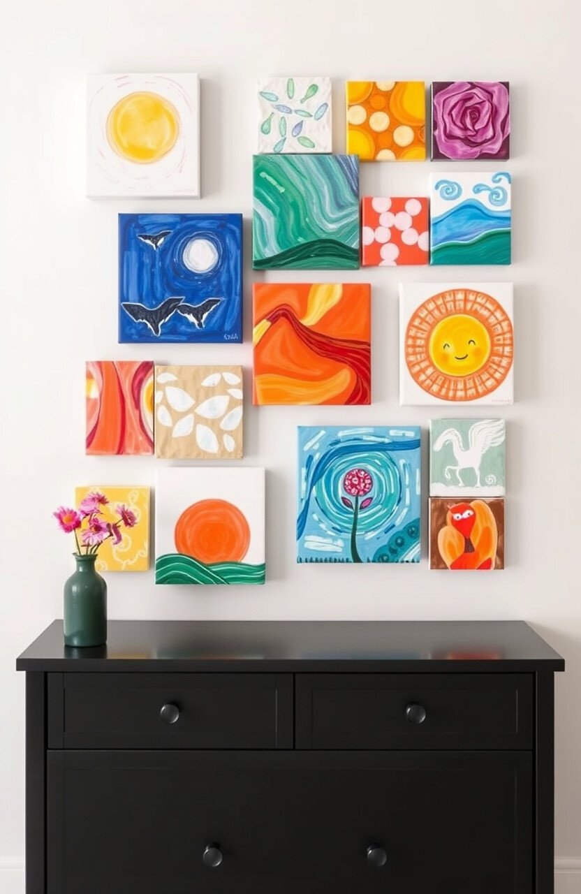 19. Art Tiles Create art tiles by mounting art on small canvases. Arrange them in a mosaic pattern.