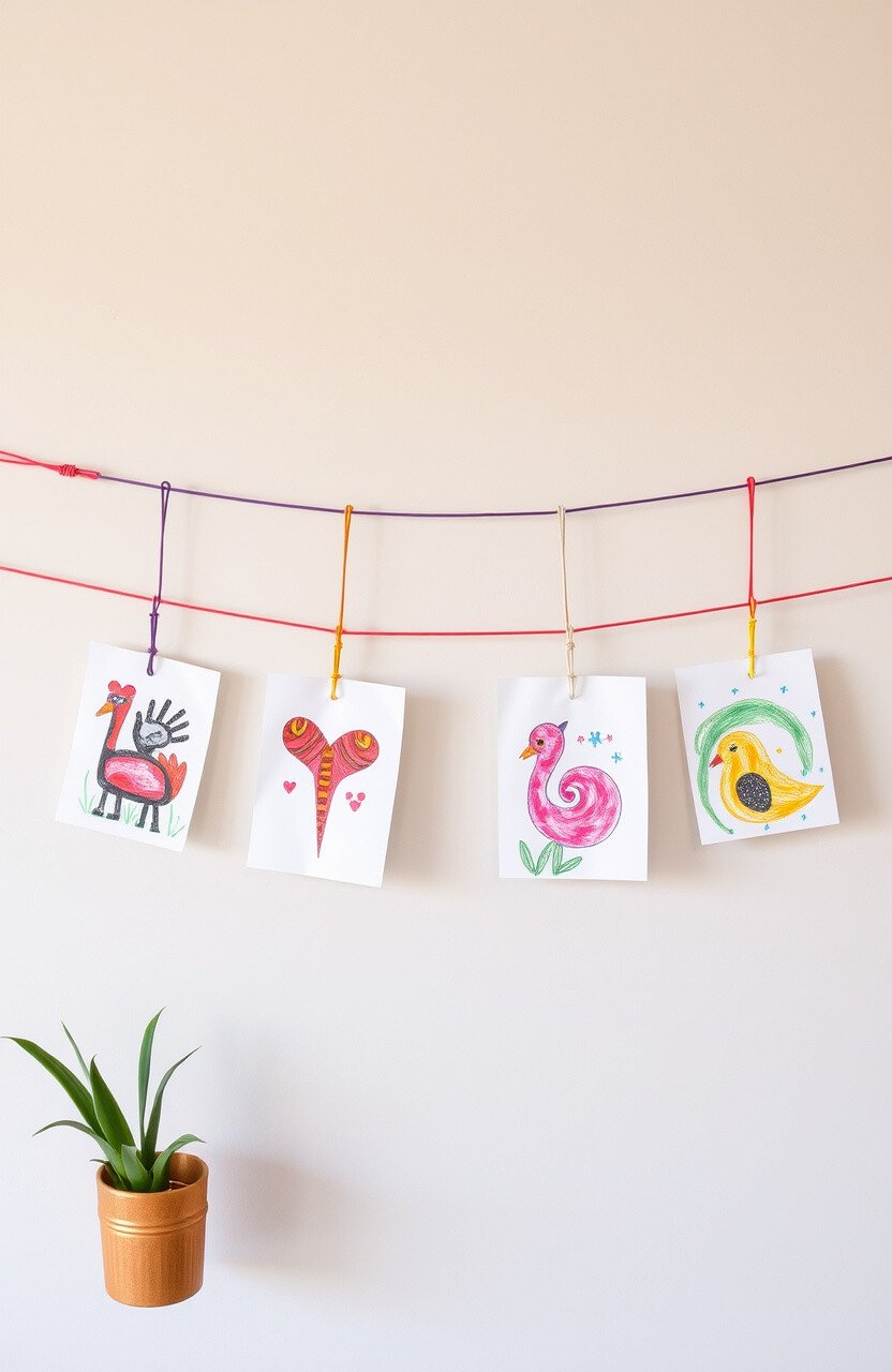 Use colorful string or ribbon for added flair. It’s a playful way to showcase art.