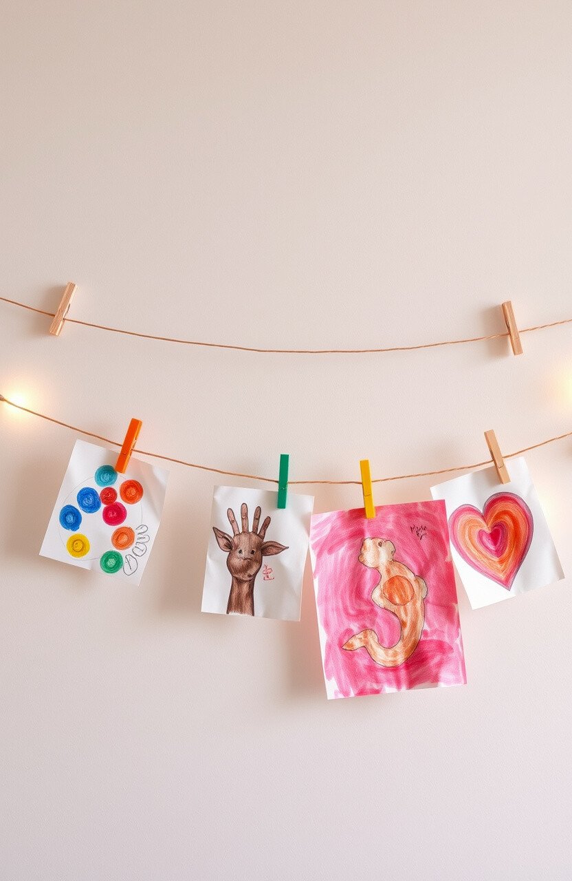 2. Art Clothesline Hang a string across the wall and use clothespins to display art. It’s easy to swap pieces in and out.