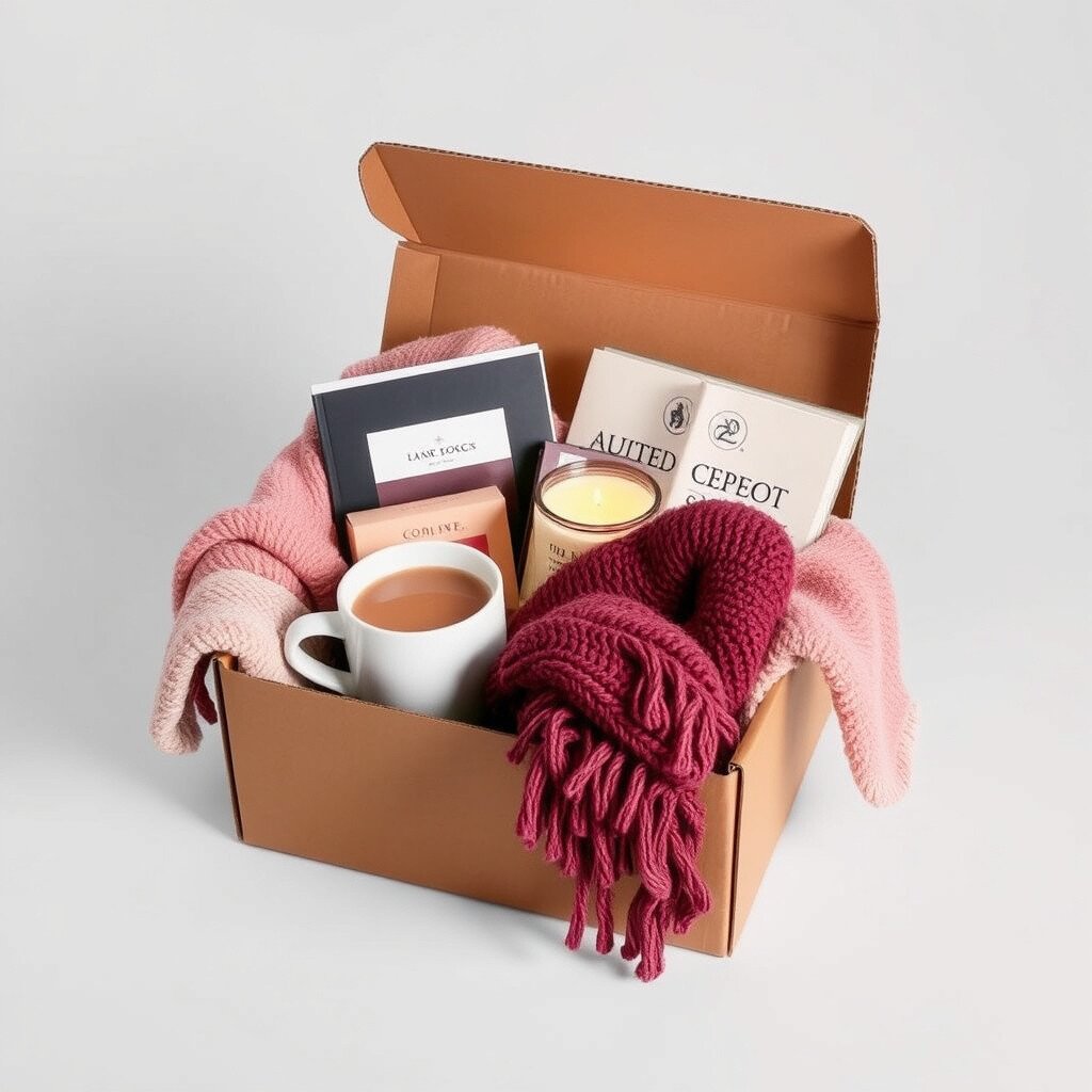 Picture a box filled with a soft blanket, a pair of fuzzy socks, and a mug for sipping hot cocoa. Add in a scented candle and your favorite book for the ultimate cozy night in.
