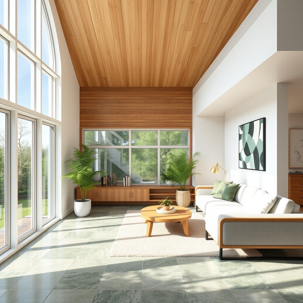 Choose sustainable materials for an eco-friendly home. Imagine bamboo floors, recycled glass tiles, and energy-efficient windows.