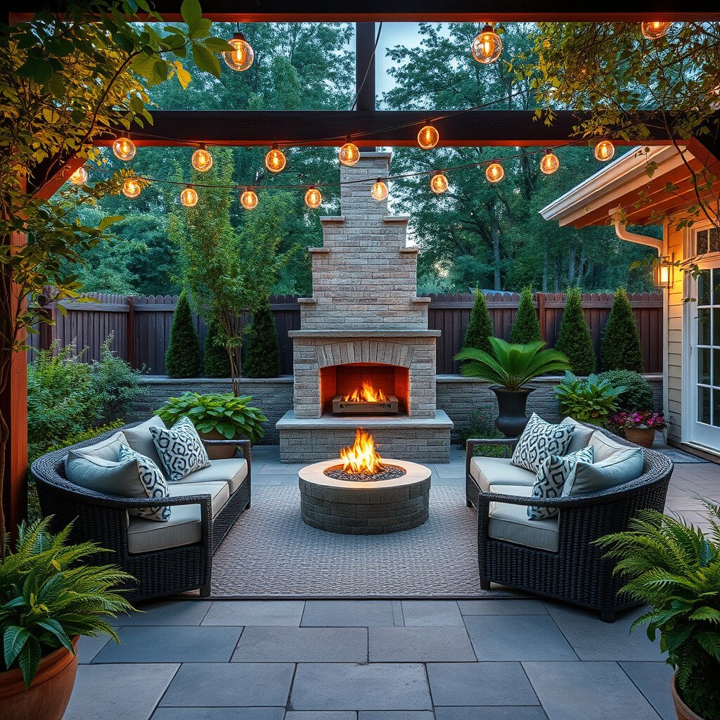Create an outdoor oasis with a comfortable seating area and lush greenery. Picture a patio with string lights and a fire pit for cozy evenings.