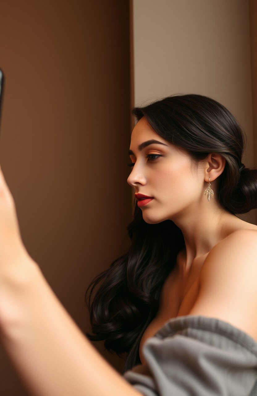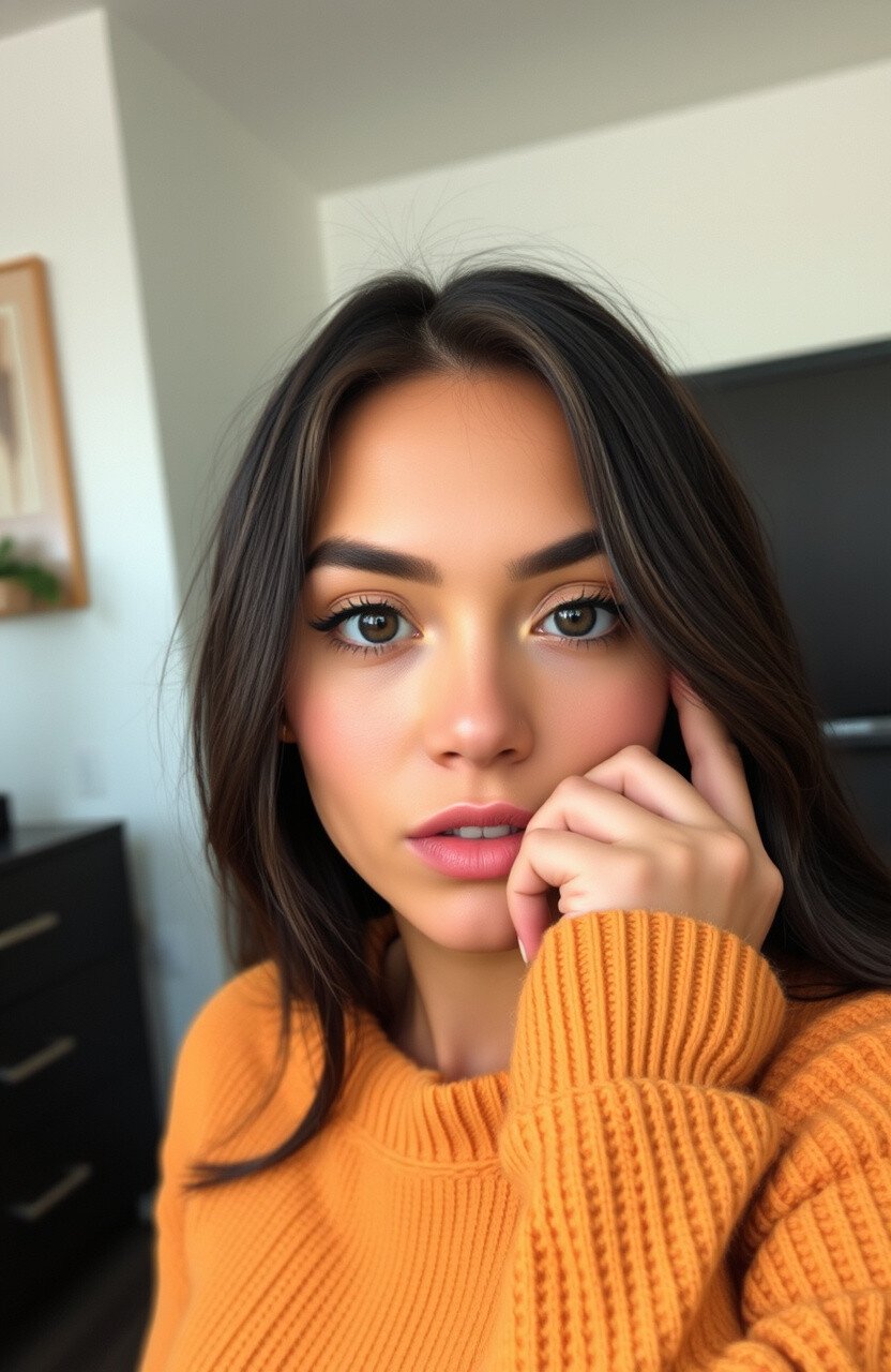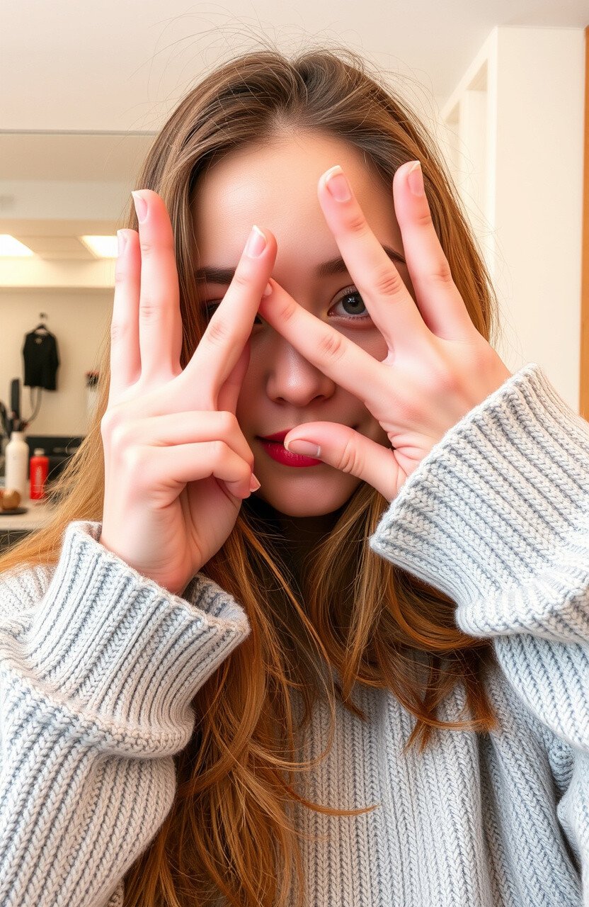 Use your hands to frame your face, drawing attention to your features. This pose can add a sense of balance and focus to your selfie. It’s a creative way to play with composition and symmetry in your photos.