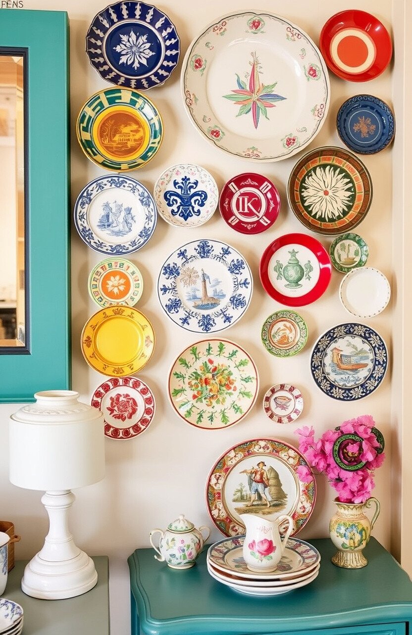 Plate displays are a fun way to decorate walls. Use colorful or patterned plates for a playful look.