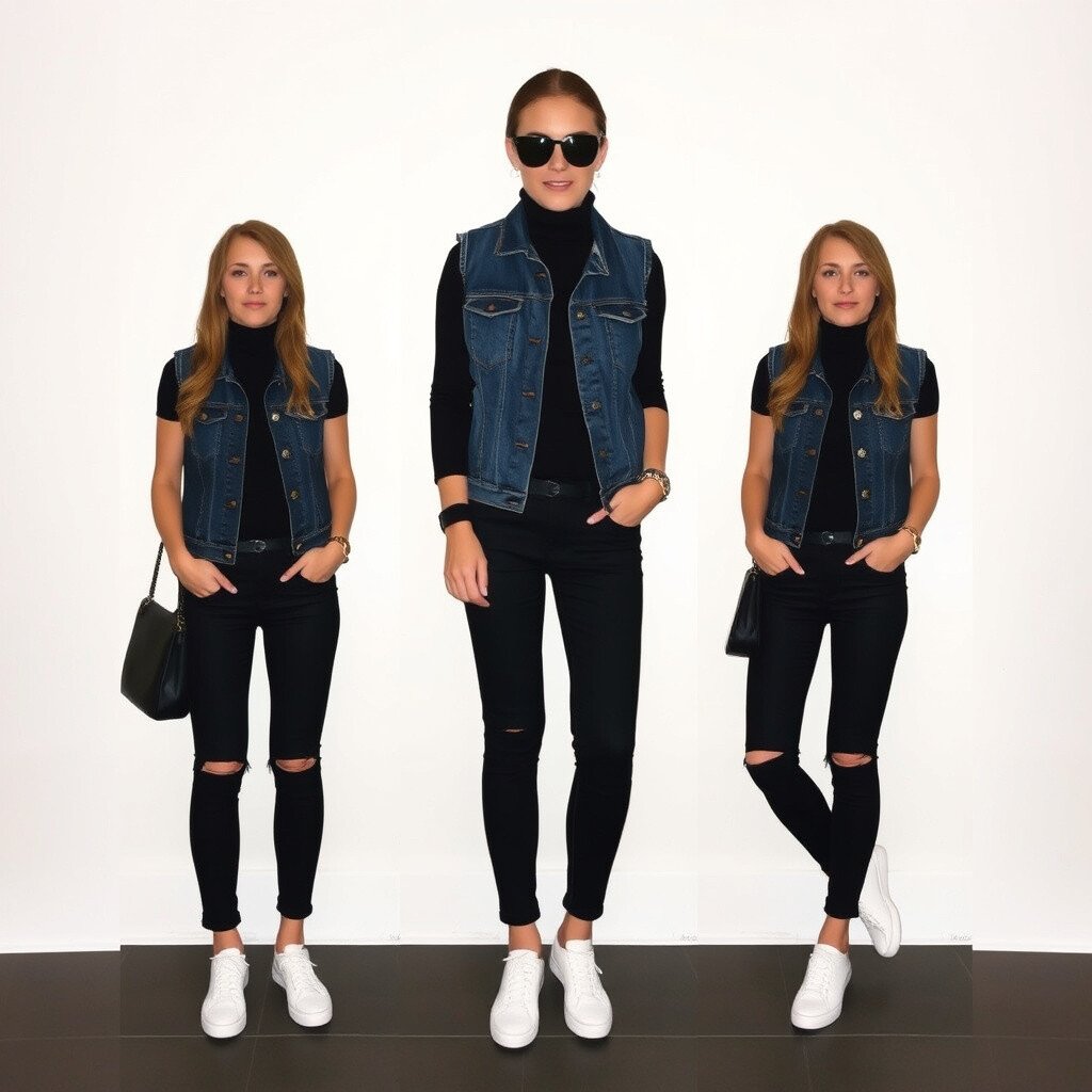 10. Sleek and Stylish For a more polished look, wear a black turtleneck under your denim vest. This creates a sleek silhouette.