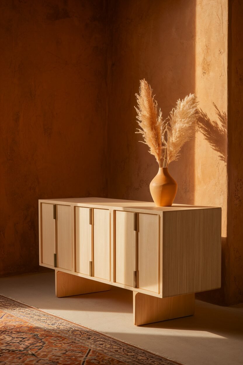 Imagine a console that brings the warmth of the countryside into your dining room with its rustic charm and wooden texture. This idea is all about embracing imperfections and natural beauty.