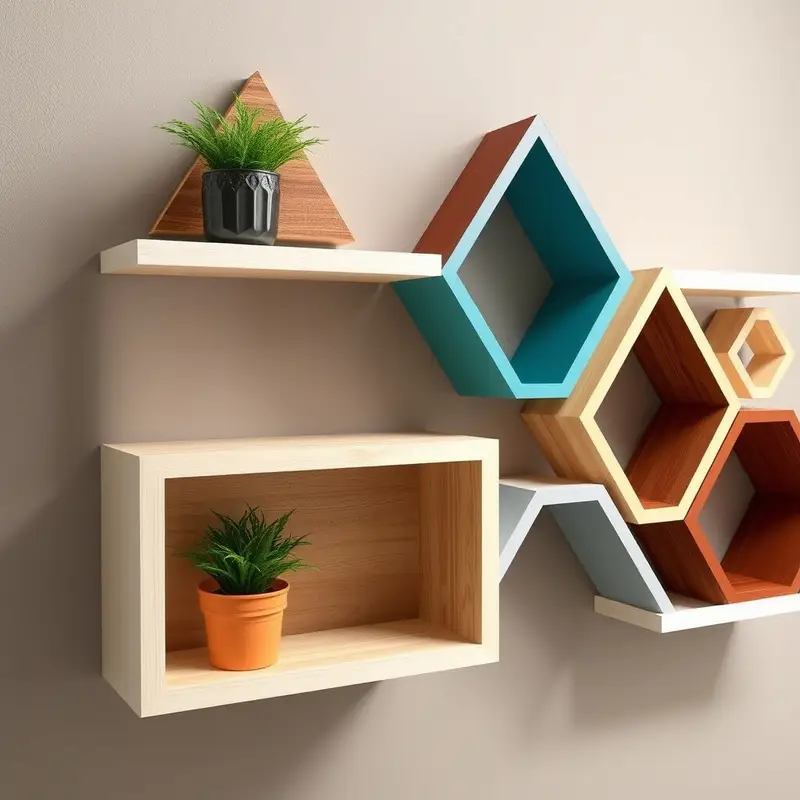 3. Geometric Patterns Add a playful element to your walls with shelves that feature geometric patterns. Triangles, hexagons, and more can be stained in contrasting colors.