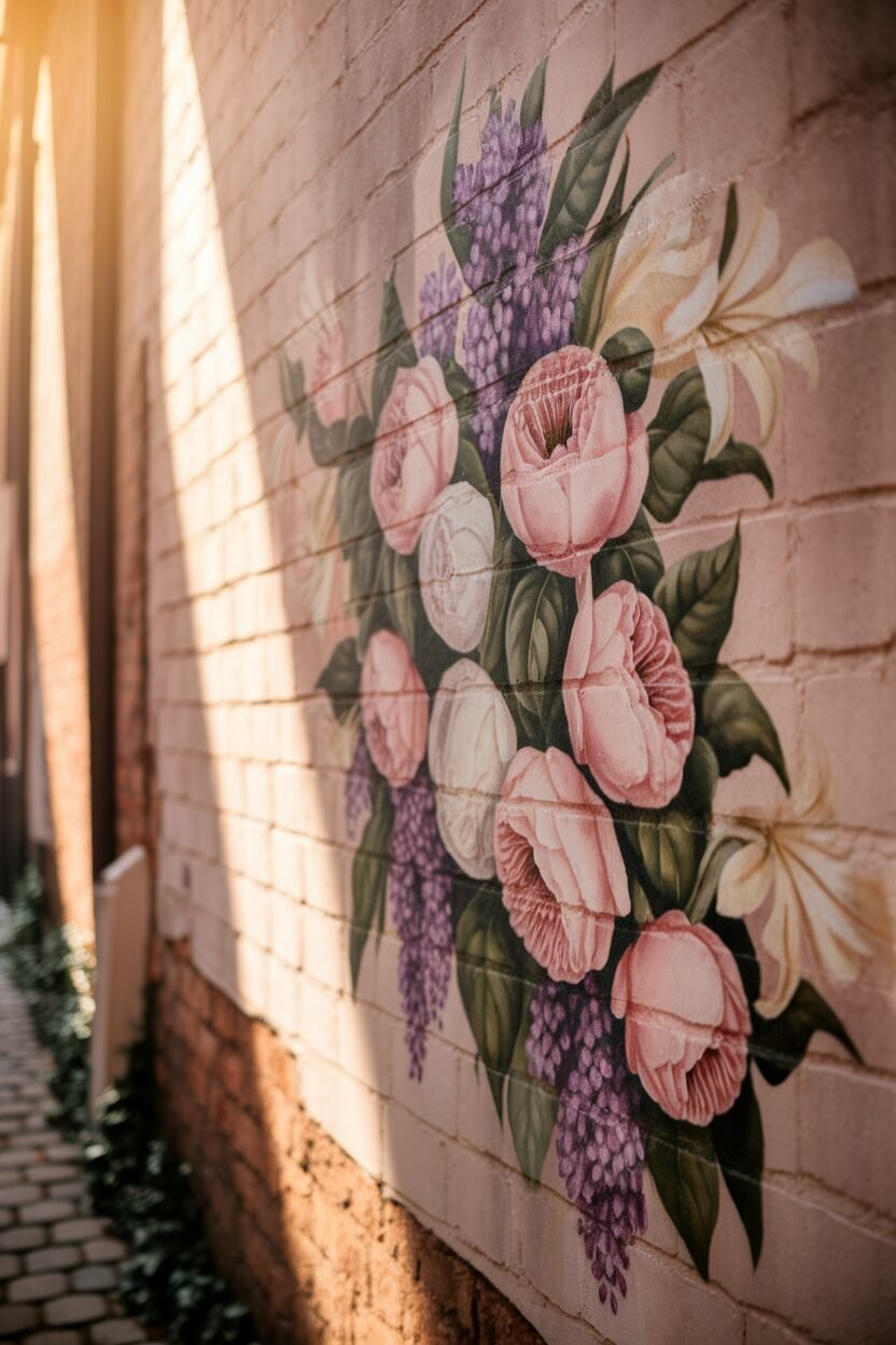 Step back in time with a vintage floral mural that adds elegance and charm to any room. The idea is to paint classic flowers like roses or peonies in soft, muted tones. This style suits those who love a touch of nostalgia and timeless beauty.
