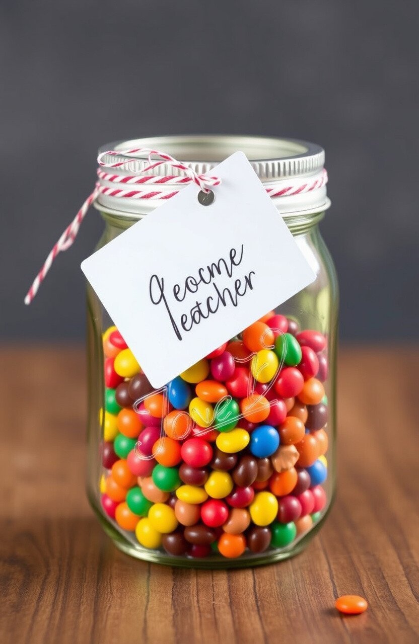 You can paint the jar’s lid to match the school’s colors or add a ribbon for extra flair. This gift is reusable, allowing the teacher to use the jar for storage later. It’s a charming and practical choice.