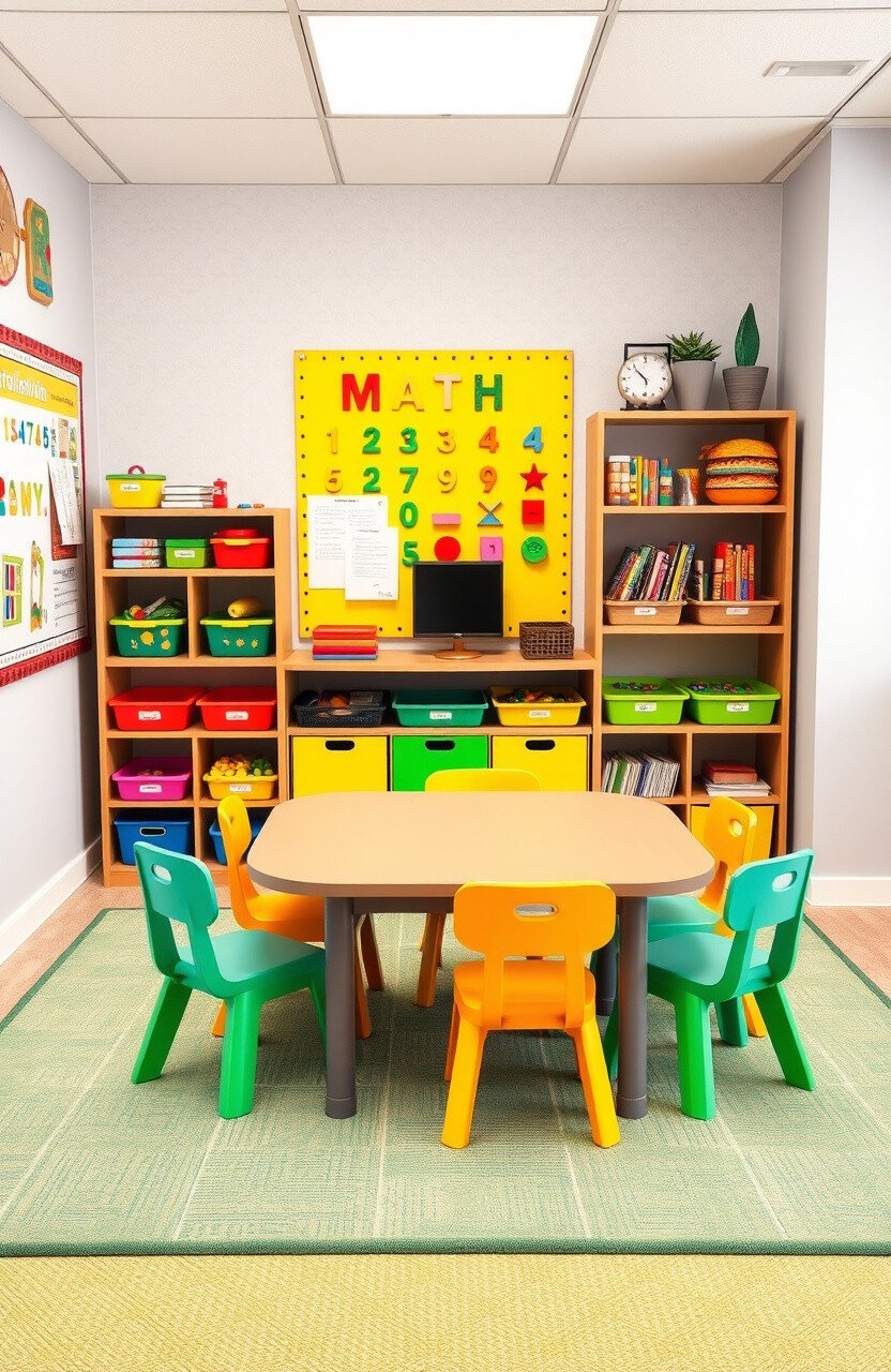 Use colorful math manipulatives to make concepts tangible. A counting wall can be a visually appealing feature.
